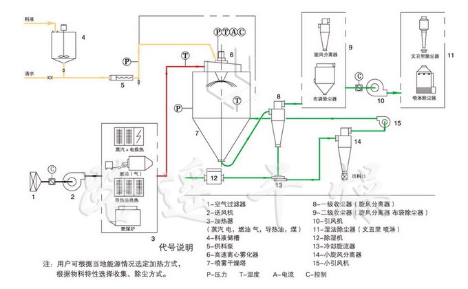 噴霧干燥機(jī)為開(kāi)式循環(huán),并流式,離心式霧化。干燥介質(zhì)空氣經(jīng)過(guò)初、中效空氣過(guò)濾器過(guò)濾后根據(jù)操作指令由鼓風(fēng)機(jī)吸取再經(jīng)加熱器加熱通過(guò)高效過(guò)濾器的熱風(fēng)分配器進(jìn)入噴霧干燥主塔。液體物料根據(jù)操作指令經(jīng)過(guò)蠕動(dòng)泵,進(jìn)入高速旋轉(zhuǎn)的離心噴頭,在離心力作用下被分散成小霧滴。在噴霧干燥主塔內(nèi),小霧滴與熱風(fēng)在充分接觸,沿其特定路徑進(jìn)行熱交換后被干燥成為產(chǎn)品,然后通過(guò)旋風(fēng)分離器實(shí)現(xiàn)分離,固體物料被收集,氣體介質(zhì)再經(jīng)過(guò)過(guò)濾后被排出。整套噴霧系統(tǒng)易清潔、無(wú)死角,符合GMP要求。