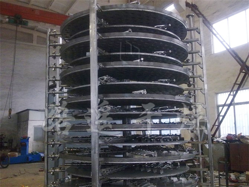 濕物料自加料器連續地加到干燥器上部第一層干燥盤上,帶有耙葉的耙臂作回轉運動使耙臂作回轉運動使耙葉連續地翻抄物料。物料沿指數螺旋線流過干燥盤表面,在小干燥盤上的物料被移送到外緣,并在外緣落到下方的大干燥盤外緣,在大干盤上物料向里移動并從中間落料口落如下一層小干燥盤中。大小干燥盤上下交替排列,物料得以連續地流過整個干燥器。中空的干燥盤內通入加熱介質,加熱介質形式有飽和蒸汽、熱水和導熱油,加熱介質由干燥盤的一端進入,從另一端導出。已干物料從后一層干燥盤落到殼體的底層,后被耙葉移送到出料口排出。濕份從物料中逸出,由設在頂蓋上的排濕口排出,真空型盤式干燥器的濕氣由設在頂蓋上的真空泵口排出。從底層排出的干物料可直接包裝。通過配加翅片加熱器、溶劑回收冷凝器、袋式除塵器、干料返混機構、引風機等輔機,可提高其干燥的生產能力,干燥膏糊狀和熱敏性物